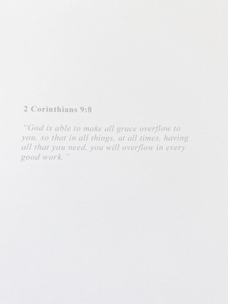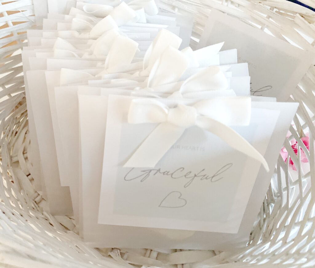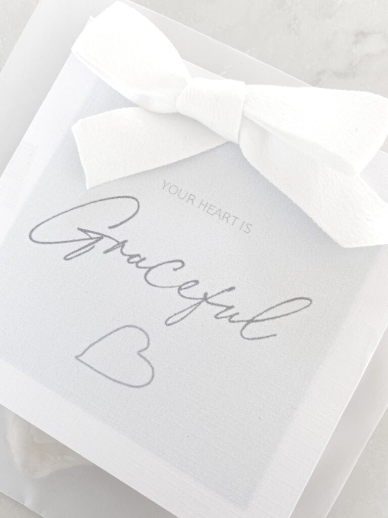 Create a card or download and print my design here as shown. It is a pretty shade of duck egg blue with “your heart is graceful” on the front. If desired you can flip the printed front on your printer and include the verse on the back. Download the “Your Heart is graceful” card (front) Download the 2 Cor 9:8 card (back).