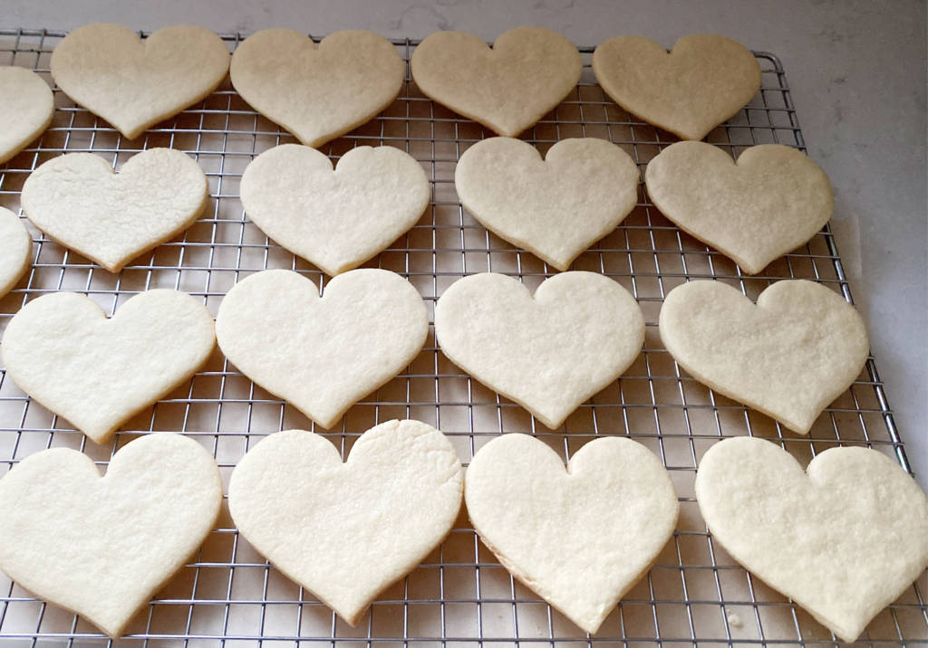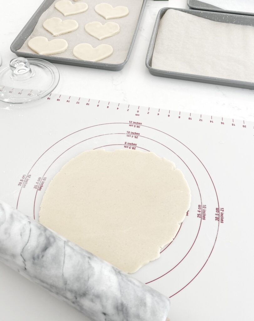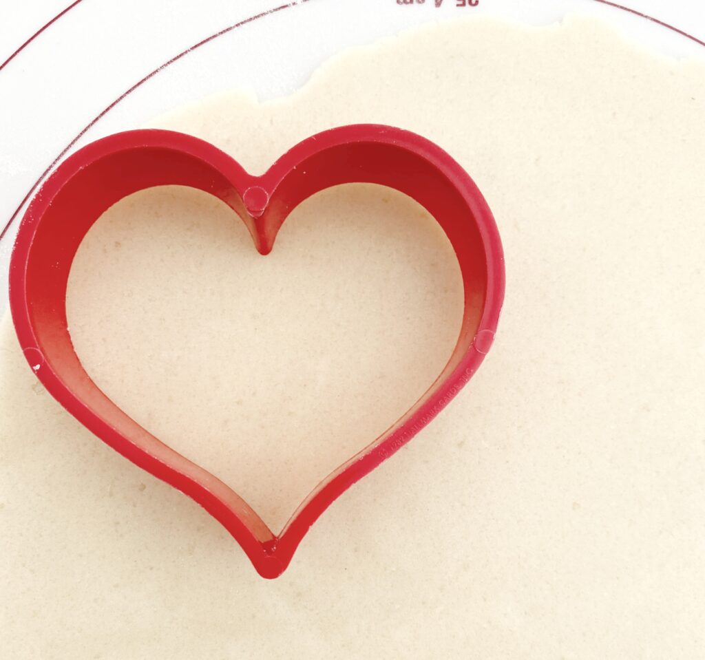 To create my Valentine cookies, I used my mom’s sugar cookie recipe (it’s the best!) which she lovingly shared with me years ago. When the time is right, I will pass this to my daughter as our family tradition. When rolling out the dough, my marble rolling pin works wonderfully as it really helps keep the dough cool and stick-free. I also use a flexible rolling sheet. Not only does it provide the perfect working space (and grid) for rolling out dough, but it also protects my countertop. The best part is that it cleans easily and rolls up for storage. This one was a great find!