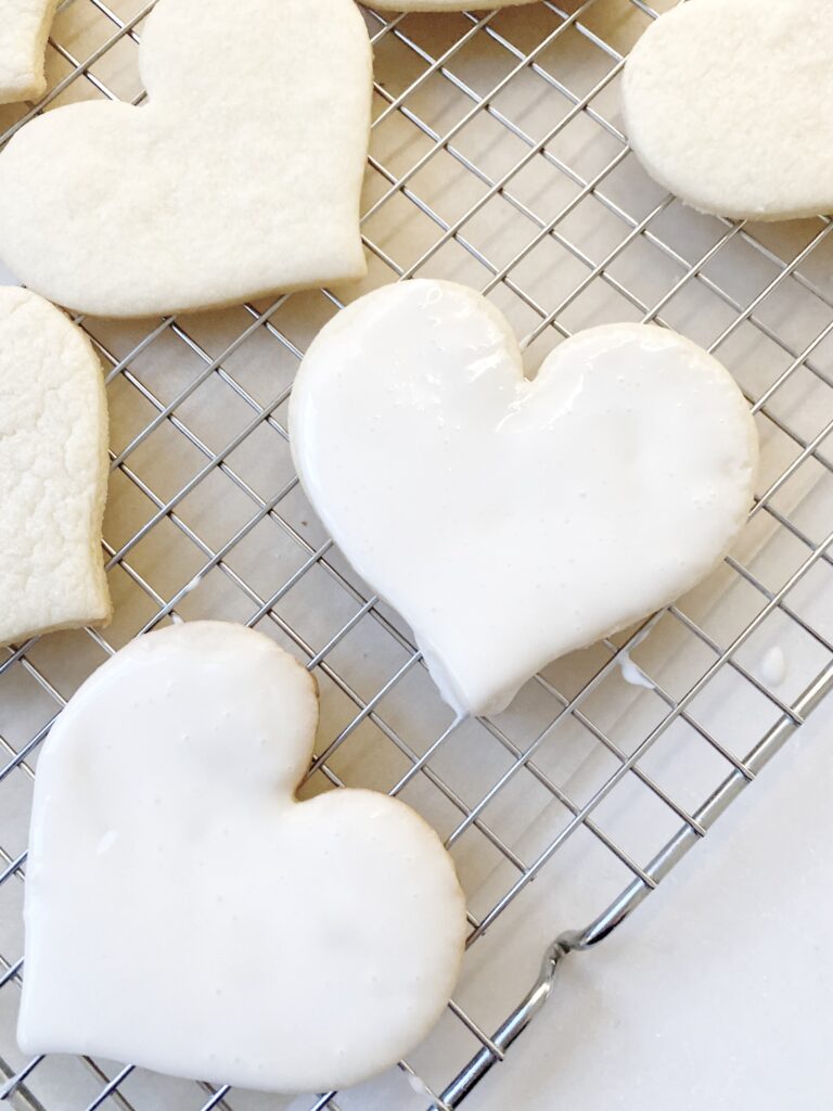 If you experience air holes after dipping. Try smoothing them with a toothpick or special icing tool. You will have plenty of time to perfect your cookie before the icing begins to set. Rest the iced cookie on a wire rack for several hours or until the icing hardens. At this point you can decorate further as you desire. Personally I love the simplicity of the simple white icing.
