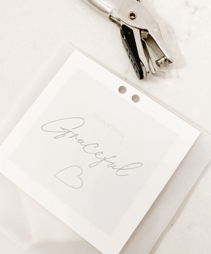 When the icing is well set, place one cookie in each 5×5 vellum bag. Then attach the “graceful” card to each using a hole punch and ribbon.