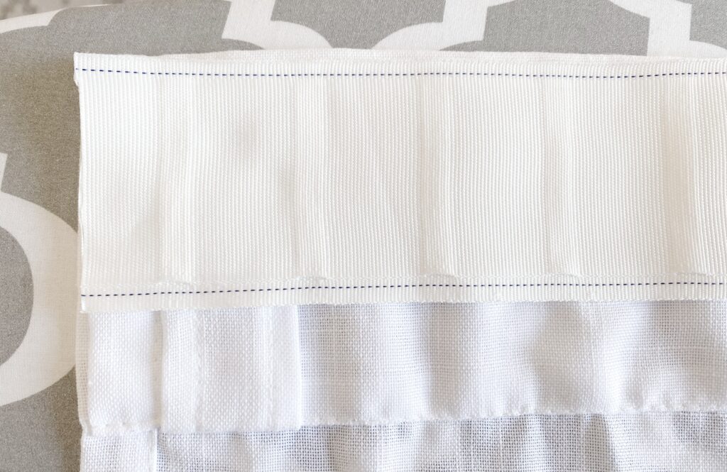Straight stich the pleat tape to the curtain on both sides. The pleat tape I chose includes sewing lines which helps in sewing straight lines in the correct location. Sew carefully being sure to avoid sewing over the little pocket at the bottom.