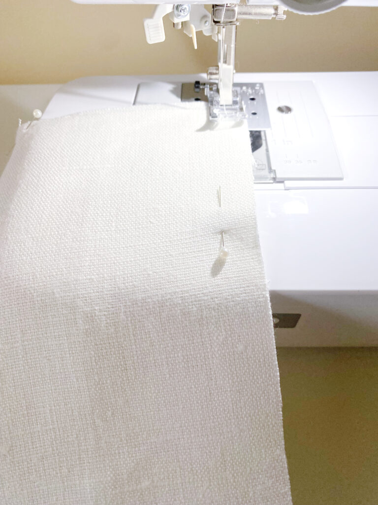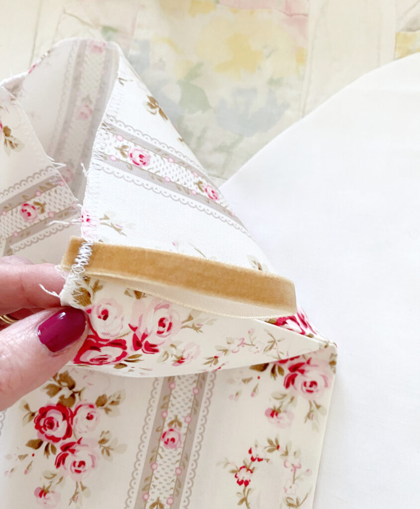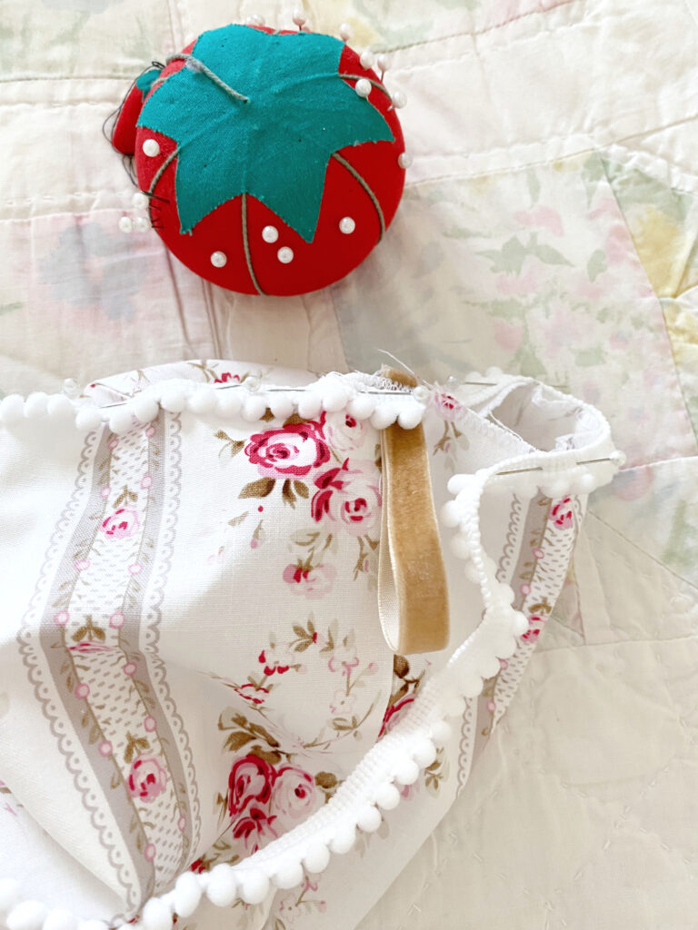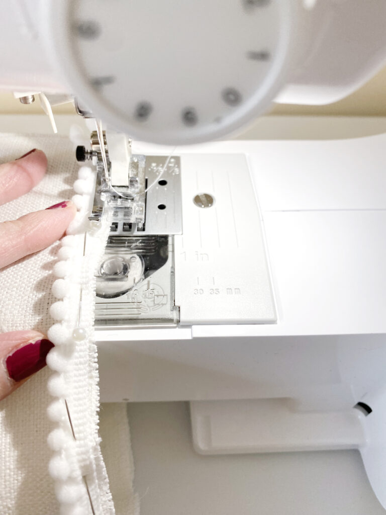 Next, pin the pom pom edging to the right side of fabric with the poms facing down. Start pinning at the loop and continue around until the ends meet.