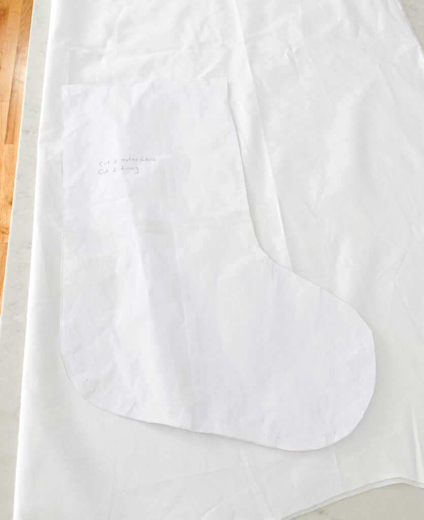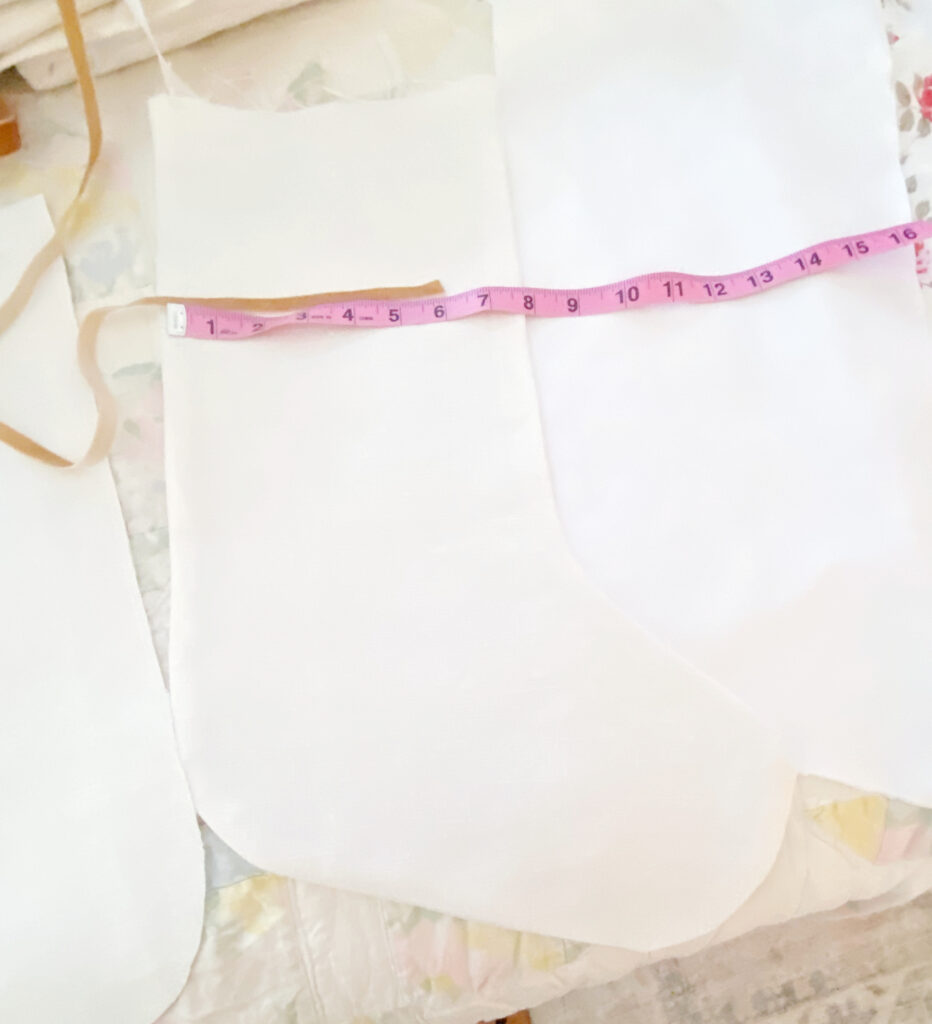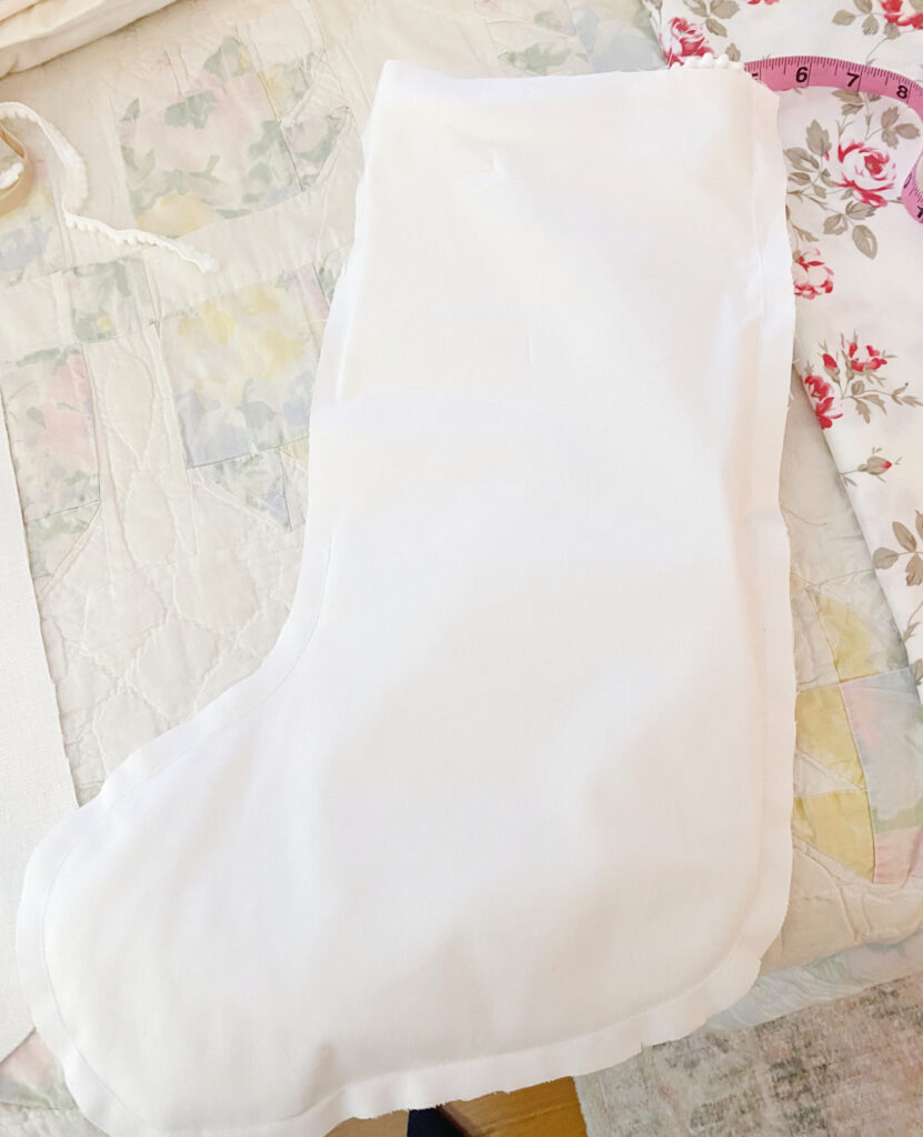 Start with the outer fabric and with right sides together, sew 1/2 inch all around the fabric (three sides), leaving the stocking top open.