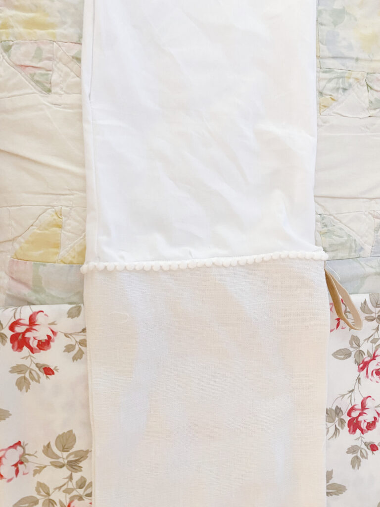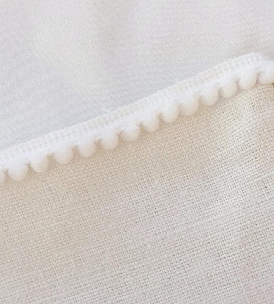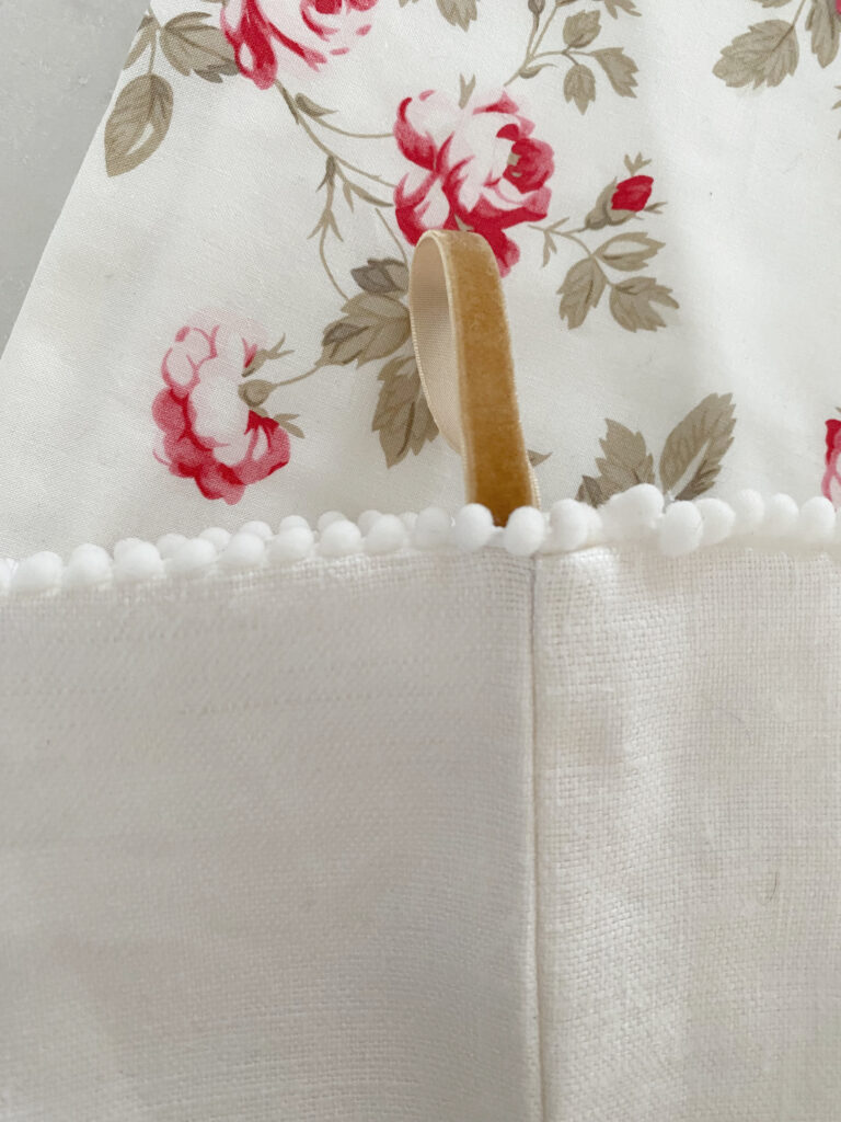 This is how it will look when the pom pom edging is sewn in place (linen fabric stocking shown).