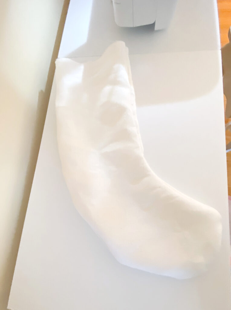 Time for sewing the lining. With right sides together sew the two pieces of lining, the same as before, leaving the the top open. But this time be sure to leave an approx. 4 inch gap on the long portion between the top and toe (see photo). The gap will be sewn later.