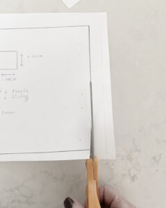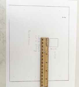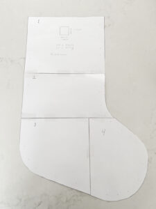 Print out the stocking pattern PDF (which contains 4 pages you will cut and assemble). Print the PDF at 100% on your home printer. After printing, measure the control square to make sure it measures 1 inch square. This is to make sure your printer is printing the pattern correctly. If so, you can continue by cutting out each pattern piece and taping them together, as shown.